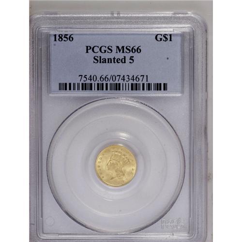 <B>1856<G$1> Slanted 5 MS66 PCGS.</B></I> Similar to large cents of the same date, 1856 gold dollars have either an Upright 5 or a Slanted 5 in the date. The latter is more available, but Gems are rare, and MS66 examples challenge the Condition Census. This lustrous and undisturbed Premium Gem is a joy to behold. The 85 in the date is slightly soft, but the remainder of the designs are well impressed. Population: 4 in 66, 3 finer (6/06).
