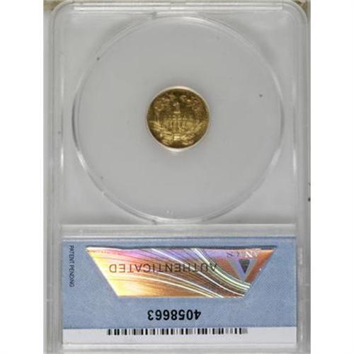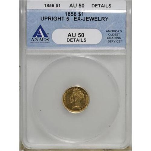 <B>1856 G$1 Upright 5--Ex-Jewelry--ANACS. AU50 Details.</B></I> NGC Census: (0/0). PCGS Population (3/91). (#7541)<BR><BR><B>Coin Engraver:</B> James B. Longacre<BR><BR><b>Shipping:</b> Coins & Currency (<a target="_blank" href="http://www.heritageauctions.com/common/shipping.php">view shipping information</a>)