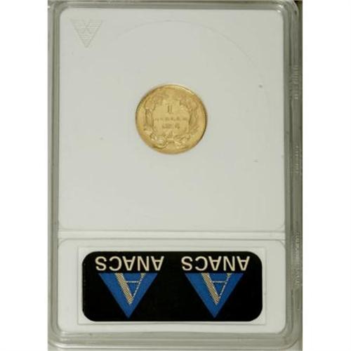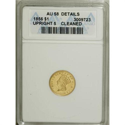 <B>1856 G$1 Upright 5--Cleaned--ANACS. AU58 Details.</B></I> NGC Census: 0 in 58, 0 finer (8/07).PCGS Population: 19 in 58, 48 finer (8/07). (#7541)<BR><BR><B>Coin Engraver:</B> James B. Longacre<BR><BR><b>Shipping:</b> Coins & Currency (<a target="_blank" href="http://www.heritageauctions.com/common/shipping.php">view shipping information</a>)