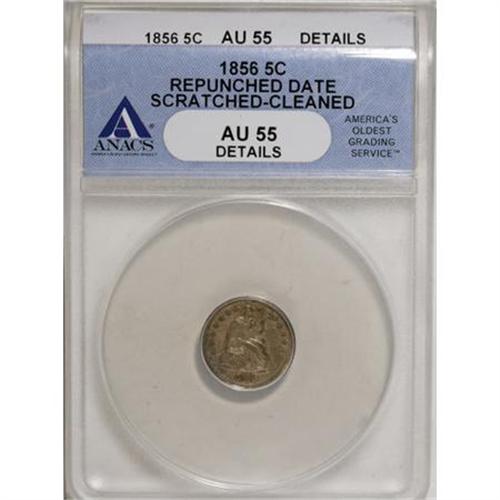 <B>1856 H10C --Cleaned, Repunched Date, Scratched--ANACS AU55 Details.</B></I> NGC Census: (11/352). PCGS Population (13/216). Mintage: 4,880,000. Numismedia Wsl. Price for NGC/PCGS coin in AU55: $105. (#4363)<BR><I>From The Al Blythe Collection of Half Dimes.</B></I><BR><BR><B>Coin Engraver:</B> Christian Gobrecht<BR><BR><b>Shipping:</b> Coins & Currency (<a target="_blank" href="http://www.heritageauctions.com/common/shipping.php">view shipping information</a>)