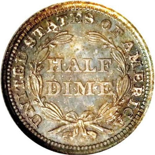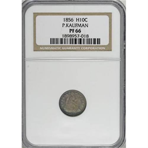 <B>1856 H10C Half Dime PR66 NGC.</B></I> Ex: P. Kaufman. The splendid Kaufman Premium Gem ranks among the finest survivors, second best of those certified by NGC. Between 35 and 50 pieces are thought to survive today, indicative of advanced mintages in 1856 that approached 100 coins, although the exact mintage was not recorded.<BR> The date is slightly right of center with the shield point entirely left of the 1 and the skirt pendant over the right tip of the 5. That digit is upright and weaker than the others, typical of these proofs.<BR> Rich sea-green toning in the fields surround reddish-gold devices with specks of silver color on both sides. The strike is full with lustrous devices and deep mirrored fields under the deep toning. Census: 4 in 66, 1 finer (6/07). <I>From The Phil Kaufman Collection of Early Proof Sets, Part One.</B></I> (#4434)<BR><BR><BR><B>Coin Engraver:</B> Christian Gobrecht<BR><BR><b>Shipping:</b> Coins & Currency (<a target="_blank" href="http://www.heritageauctions.com/common/shipping.php">view shipping information</a>\)