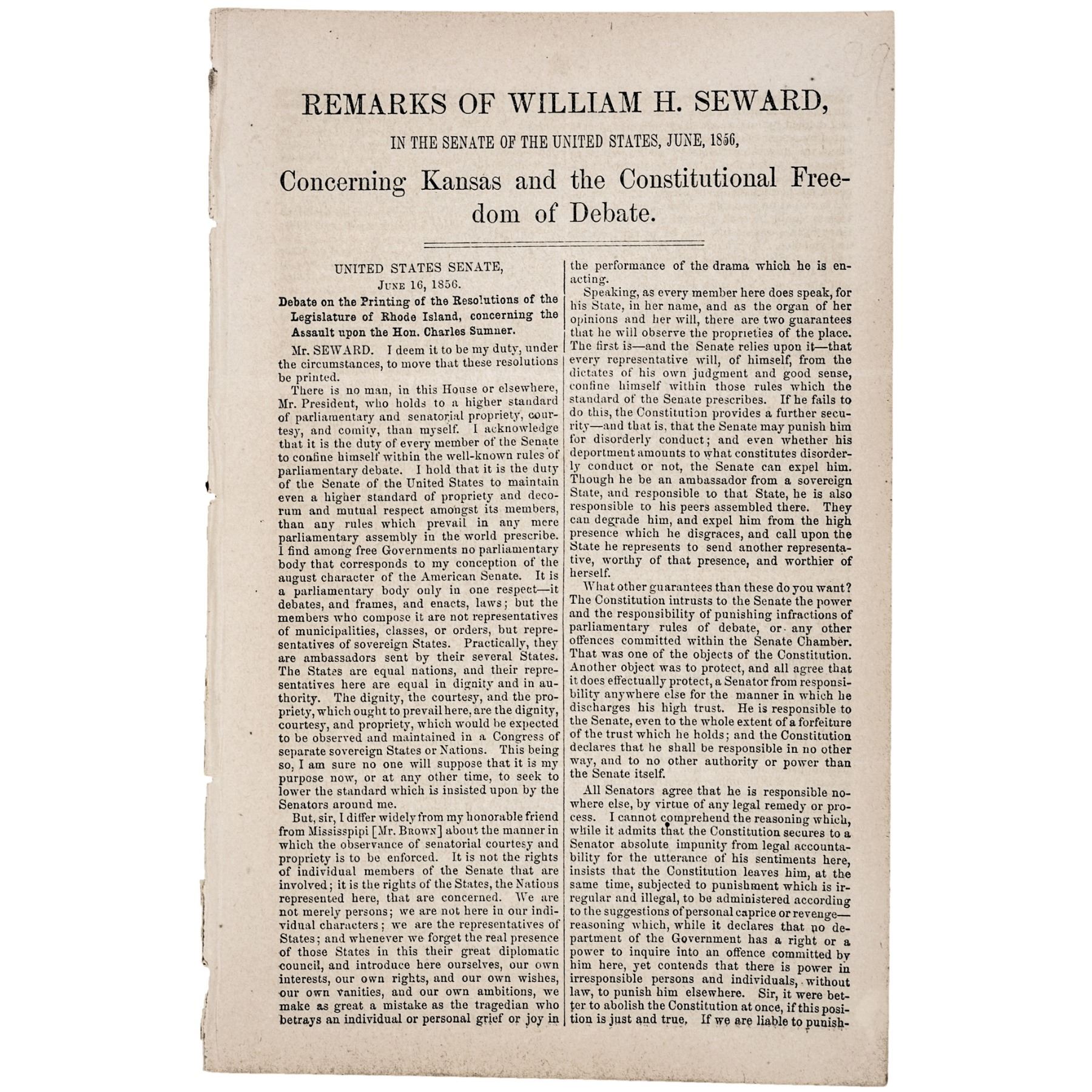 Imprint featuring the text of William Seward’s historic June 16, 1856 Speech before the U.S. Senate. He focuses on the Kansas & Antislavery Debate and the famous physical beating of Senator Charles Sumner which occurred on the floor of the U.S. Senate by a Pro-Slavery colleague from the South. Disbound, measures 9.2” x 5.6”, 8 pages, tone, with partial separation along its spine. Here, Seward defends Sumner’s right to speak disparagingly about a colleague, and that he was protected by the U.S. Constitution... although he agreed that Sumner’s remarks were libelous, he disagreed that he should be punished or physically assaulted for it, and states: “When occurrences like this shall happen, then there will no longer be either free government or liberty in the land.” Engaging additional debate is also included in this publication, being between Seward and other Senators.