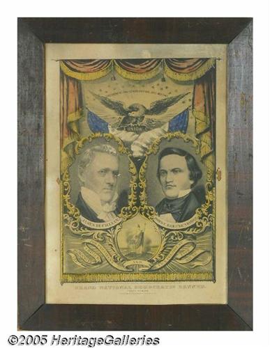 <B>1856 James Buchanan and John C. Breckinridge Currier Grand National Banner Print</B></I> "One Country -- One Continent -- One Destiny/The Democrats Choice for President and Vice President from 1857 to 1861." Typical light "aging" and soiling. Nice borders. Two minor holes in border only. Minor wear in Buchanan's coiffure. 12.5" x 16.5" in original wood frame. Lot:256