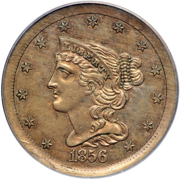 1856 Judd-177 Pattern Strike in Copper Nickel R5. PCGS graded Proof 63. Glossy light silvery gray and steel with hints of iridescent rose and bluish steel in protected areas on the reverse. The fields on both sides are reflective but the mirrors are not especially deep, which is typical of these copper nickel strikes. The notable defects are a faint planchet lamination line from the date through star 1 into the dentils at the left plus a collection of tiny planchet voids in the dentils over the left top of the U in UNITED, all as struck. The strike is slightly soft, as nearly always seen on this pattern. The weakness is most obvious on the obverse dentils and highpoints of the wreath. Our grade is Proof-60. The J-177 attribution is noted on the PCGS label. Pop 8; 17 finer at PCGS.