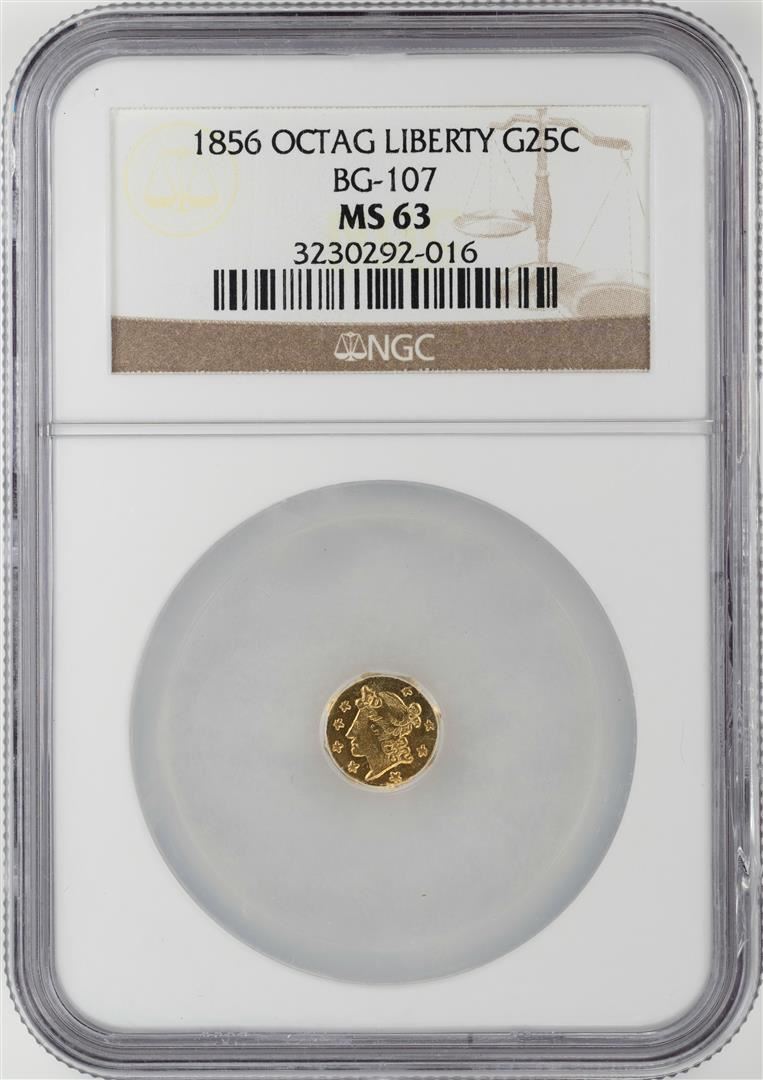 One 1856 Liberty Octagonal Gold Quarter Coin NGC MS63 BG-107. NGC Certified.