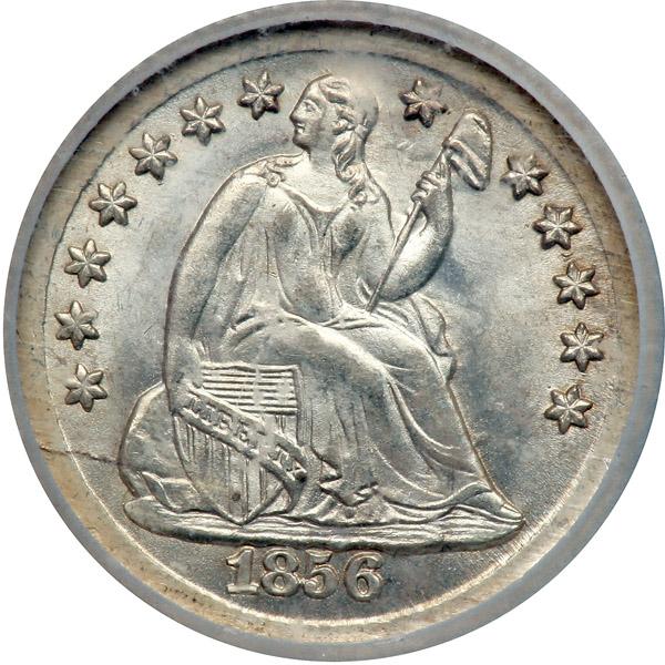 1856 Liberty Seated Half Dime. CGA graded MS-67. A well struck frosty mint gem, untoned. Super luster and color. Has the usual light detail on the rim denticles, though stars are complete and so unaffected. Creamy smooth surfaces. Our grade is MS-66.