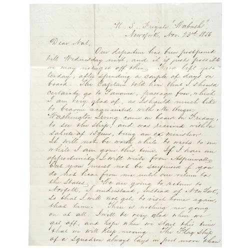 <Our item number 140893><B>1856 Voyage To Nicaragua Against the Adventurer William Walker.</B> Autographed letter signed ("A.O. Shuff"), on lined, two-page integral sheet with address leaf, from the "U.S. Frigate Wabash," 9¾ x 7¾ in., New York, 23 Nov. 1856. To N.C. Shuff at Philadelphia, reporting on preparations to sail to Nicaragua to put down the expedition of American William Walker, who planned to unite Central America into an Anglo-dominated republic in the same way that Texas was established in the early 1800s.Fine; small seal tear. Accompanied by an 1853 Liberty Seated Quarter, With Arrows Type, hand-engraved to mark the launching of the new steamship FRIGATE USS WABASH in 1855, Choice EF-45. Engraved "A.M. KELLY - Oct. 24, 1855" with "WABASH - Couldn't go - rain'd." It has nice blue-gray toning, well detailed surfaces, with a hole located at Liberty's head for suspension, as intended. The USS Frigate Wabash's maiden voyage was to Nicaragua to foil William Walker's plan. <BR>Estimated Value $1,000 - 1,500. <BR><BR>Our item number 140893<BR><IMAGES><P ALIGN="CENTER"><IMG SRC="http://www.goldbergcoins.net/liveauction/49jpegs/140893.jpg"> </P></IMAGES>