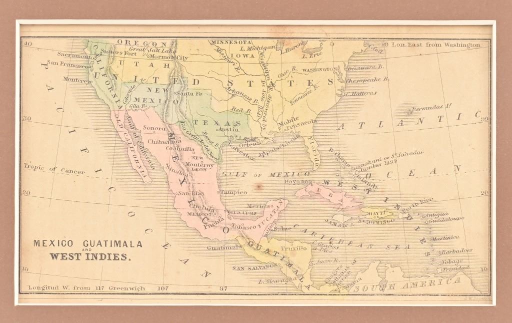 Mexico, Guatimala and West Indies. Period coloring highlighting Texas, New Mexico and California. Engraved by G.W. Boynton. 1856