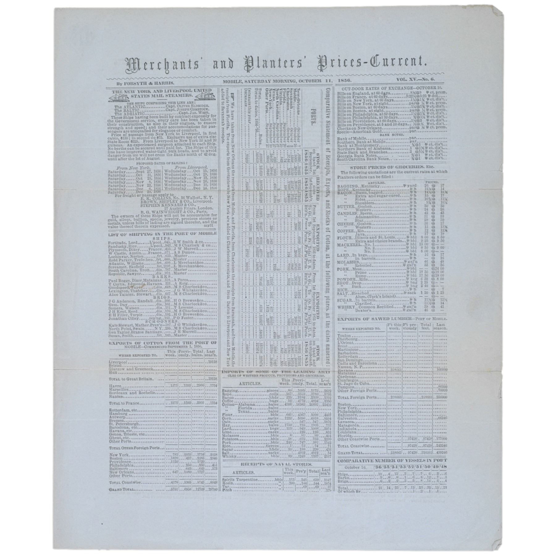 October 11, 1856, “Merchants’ and Planters’ Prices Current,” Published by Forsyth and Harris, Mobile, Alabama, Choice Fine.
