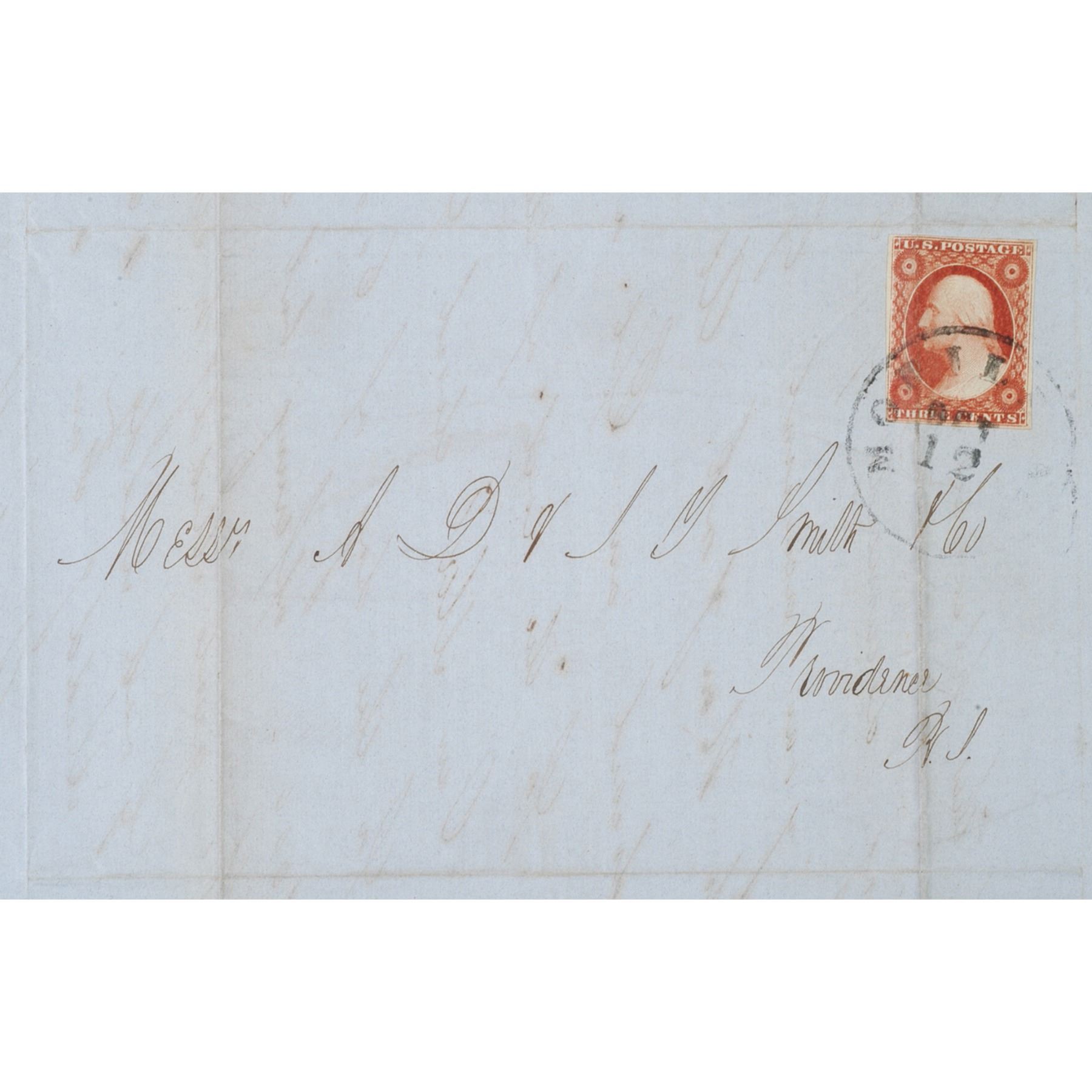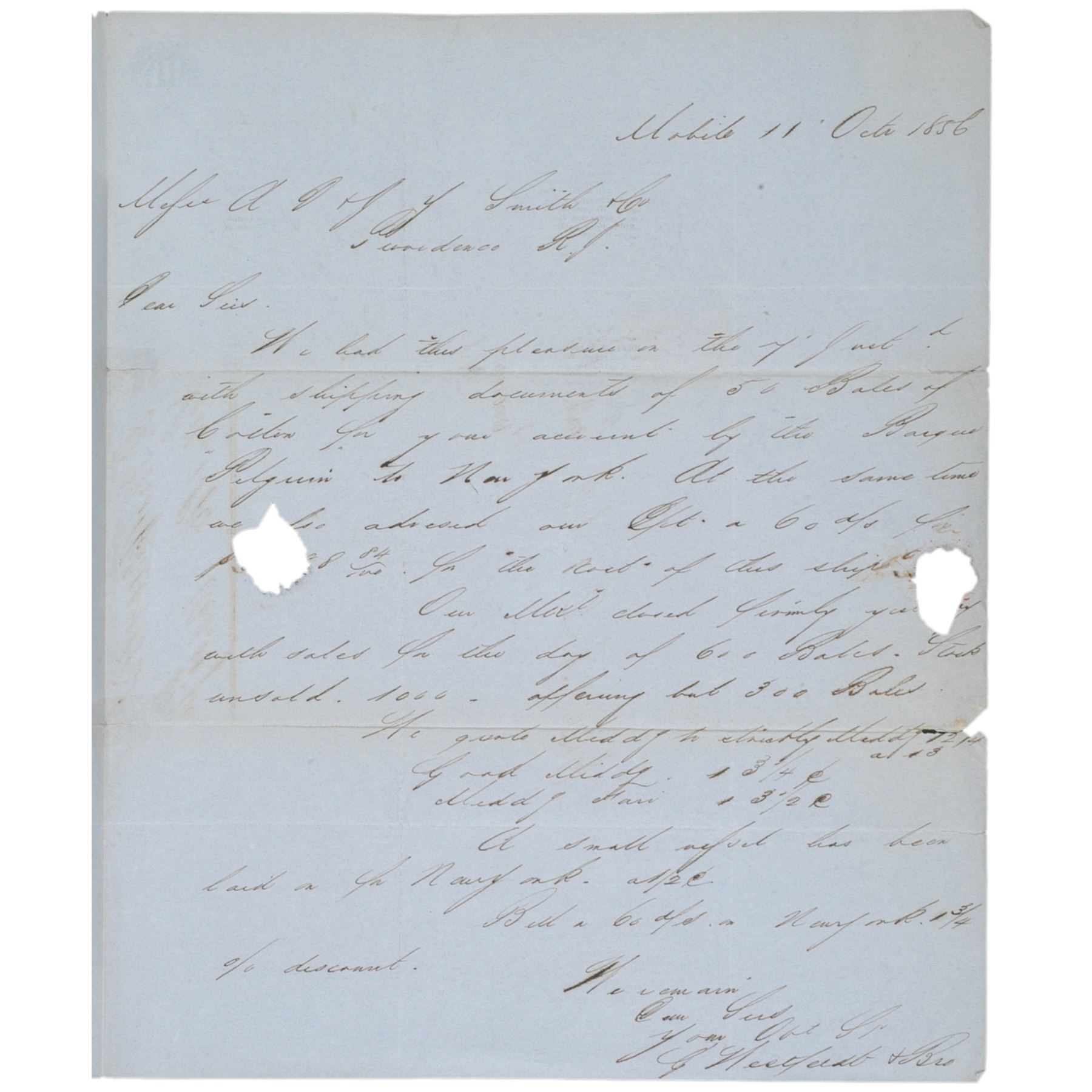 Two-page manuscript measures 11” x 9”, and includes a mailing leaf and manuscript letter; the newsletter provided a monthly update as to the prevailing market price of numerous goods, including cotton, that were exported to both the Eastern Seaboard and European ports of call. On the reverse side is a one-page manuscript letter written by G. Westfeldt & Bro. on Oct. 11, 1856 to Smith & Co., Providence, Rhode Island. It reads in part: “We had the pleasure... with shipping documents of 50 Bales of Cotton for your account by the Baque ‘Pilguin” ...our market closed firmly yesterday with sales... of 600 bales.” The original transmittal leaf has a three cent stamp and has a circular “MOBILE” postmark. Light soiling, minor edge splits along folds, and two small holes resulting from the missing wax seal.