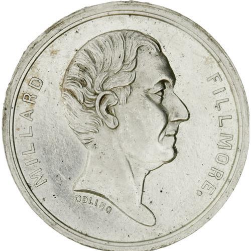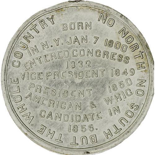 <B>1856 Millard Fillmore Campaign Medal in White Metal.</B></I> Listed as Sullivan-Dewitt MF 1856-1, measuring 39mm. This is the largest variety of Fillmore's ticket for this year. The inscription reads "No North No South But The Whole Country". In AU condition with much of its original luster. The engraver's name "Odling" is visible on the truncation of the portrait.