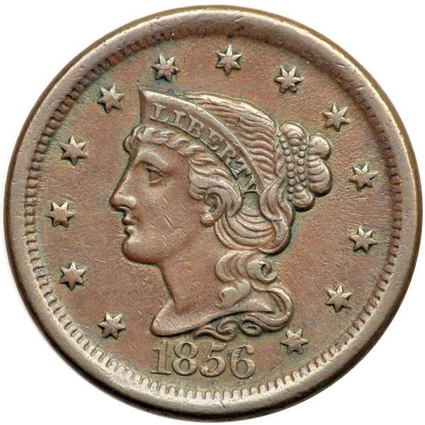 1856 N-1 R1 Italic 5 VF30. Close to VF35 but there are several small rim nicks on the reverse plus a light rim bruise at the U in UNITED and a planchet chip on the leaf over O in ONE. Glossy medium brown with flowline luster in protected areas. MDS, die state b. The die lines over UN are gone but there are no rim cuds. DWH #1566.