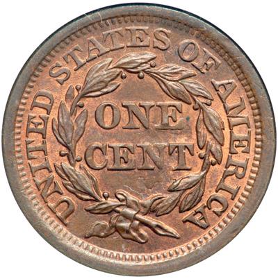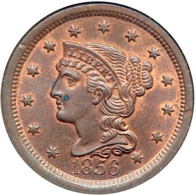 1856 N-1 R1. NGC graded MS-64 Red & Brown. Italic 5. Frosty olive and steel brown with 25% of the slightly faded mint color remaining on both sides. This cent is lustrous and choice except for a small carbon spot just right of the nostril, a dull nick on the rim over star 4, and another on the rim at star 11. Nicely struck MDS, die state b. The fine die lines over UN are gone but there are no rim cud breaks on the reverse. Our grade is MS62.
