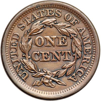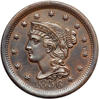 1856 N-10 R1. AU-50. Upright 5. Sharpness near mint state but lightly cleaned, now retoned frosty olive and light chocolate. The obverse is several shades darker than the reverse. No spots or contact marks, but the reverse is covered with extremely faint granularity. MDS, die state b.