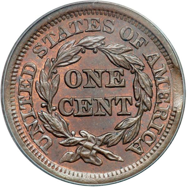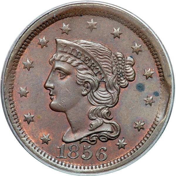 1856 N-11 R1 Upright 56 PCGS graded MS63 Brown. Lustrous bluish steel brown and chocolate with 15% of the faded mint color remaining, mostly on the reverse. The surfaces are covered with attractive satiny mint frost. A choice example except for two spots of dark toning above star 11 and a trail of microscopic ticks on the chin. The most obvious feature on this cent is a minor planchet clip that weakens the dentils at star 11 and the opposing ones at ME. EDS, die state a, showing the short spike from the left top of the R in AMERICA. Our grade is MS60+. The attribution is noted on the PCGS label. Pop 1; none finer at PCGS in BN.
