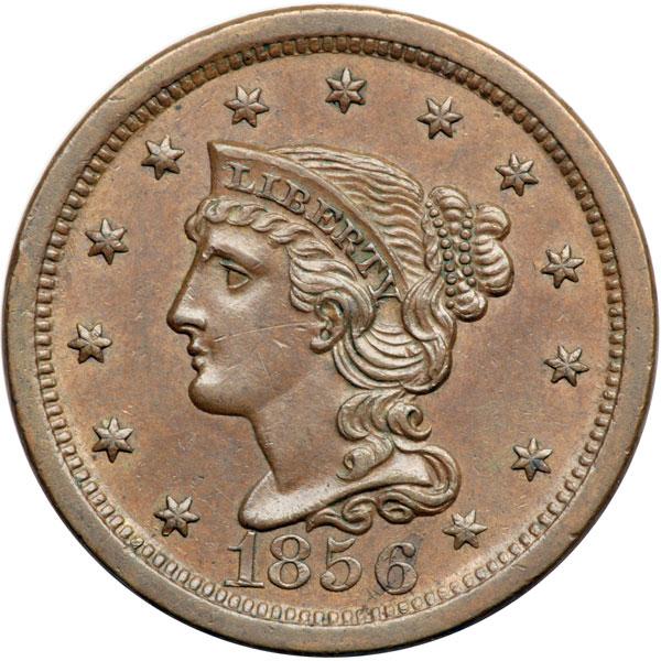 1856 N-12 R1+ Upright 5 AU50. Glossy medium brown with frosty lighter brown in protected areas and peeps of faded mint red on the reverse. A couple very faint hairlines on the cheek and a tiny tick on the rim under star 12. EDS, die state a early. All the fine die lines are sharp, including the ones at ITE in UNITED. DWH#1585.