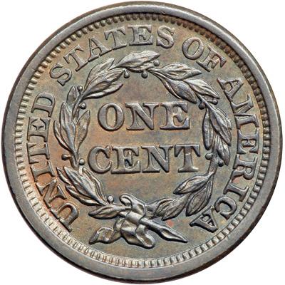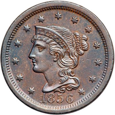 1856 N-12 R1+. AU-58. Upright 5. Frosty light chocolate brown mixed with darker steel and olive brown toning. No notable defects, just the slightest touch of rub on the highest points from mint state. E-MDS, die state a. The fine die lines over IT in UNITED are weak but remain visible.