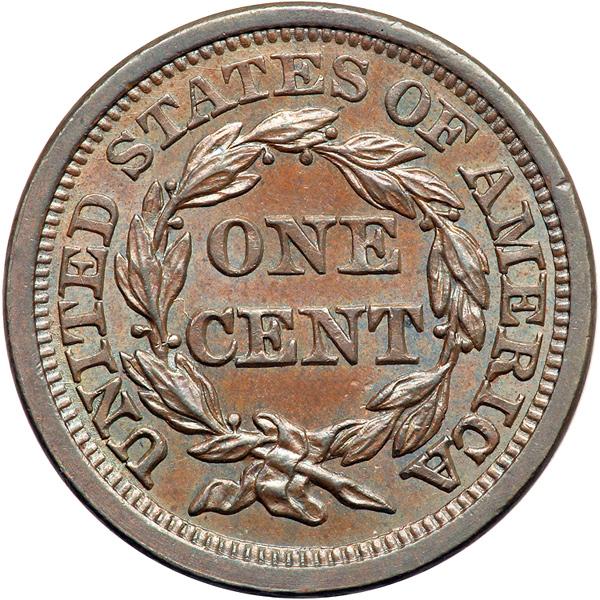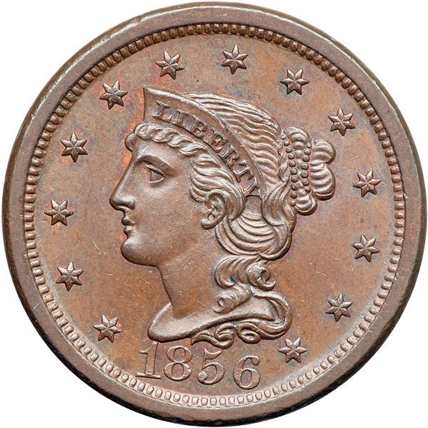 1856 N-12 R1+. MS-62. Upright 5. Lustrous light chocolate and bluish steel brown with traces of mint red remaining on the obverse. The surfaces are satiny and offer outstanding eye appeal. The only mark is a faint spot of slightly darker chocolate toning near the dentils left of the date. Sharply struck VEDS (very early die state). The fields on both sides are covered with fine die polishing lines and all the die finishing lines are sharp. The earliest state seen. Tied for CC#9 overall in the Grellman census but equal to the finest known in the earliest die state.