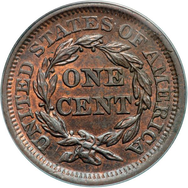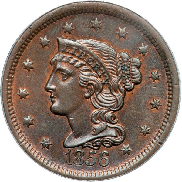 1856 N-14 R1 Italic 5 PCGS graded MS64 Brown. Glossy chocolate and steel brown with 15% of the mellowed mint color remaining, mostly on the reverse. There is a small spot hidden in the hair bun, a couple tiny ticks on the front edge of the neck, and another on the rim at star 12. None of these marks is significant and the eye appeal remains quite nice. MDS, die state b. Our grade is MS60+. The attribution is noted on the PCGS label. Pop 1; none finer at PCGS in BN.