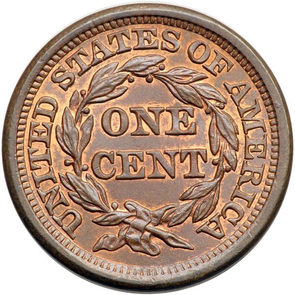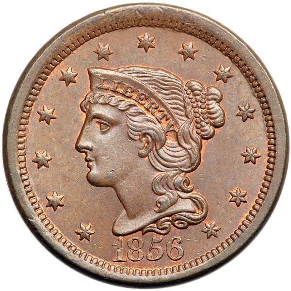 1856 N-17 R2 Italic 5 MS62. Lustrous steel brown with 5% of the mint red remaining on the obverse, 20% on the reverse. There are a few trivial contact marks, including a tiny pinprick on the jaw over the throat. E-MDS, die state a, with fine die lines down to the right from the bottom of the outer hair bun. Tied for CC#4. Removed from an NGC slab graded MS65BN (NGC label included). DWH #2272.