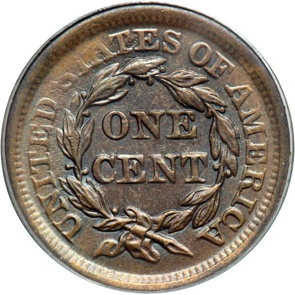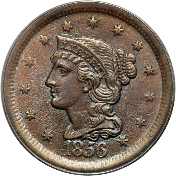 1856 N-18 R1 Italic 5 PCGS graded MS62 Brown. Attractive lustrous light olive and steel brown with subtle overtones of light bluish steel. This cent offers excellent eye appeal and is essentially flawless except for a dull scratch reaching from the top of star 5 into the field under star 6. M-LDS, die state c late. The fields are covered with strong radial die flowlines and STA are weak from excessive die wear, but the terminal rim cud over TE in STATES has not formed. Our grade is net AU58. The attribution is noted on the PCGS label. Pop 1; none finer at PCGS in BN.