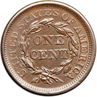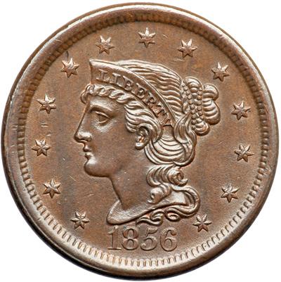 1856 N-2 R1. AU-58. Italic 5. Choice glossy light to medium chocolate brown with traces of mint red showing on both sides. A beautiful example with mint state eye appeal. A microscopic planchet chip above star 5 and a dull rim nick at the second A in AMERICA are the notable marks. LDS, die state f. The reverse die is worn so ED-STATES is now weak.