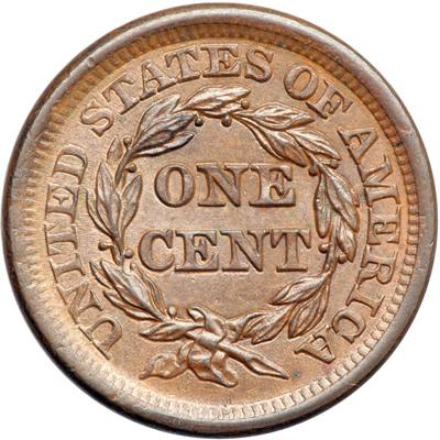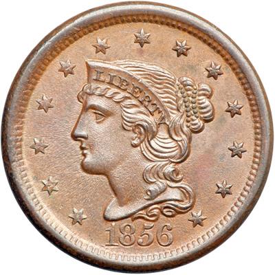 1856 N-21 R2. MS-60. Italic 5. Frosty steel brown and chocolate. Great eye appeal for the grade, virtually flawless. A hint of darker steel toning on the leaves over the O in ONE and a speck of similar toning off the end of the wreath stem are the best identifying marks. MDS, die state a late. The die line from the dentils to the top of the second S in STATES is weak but still visible.