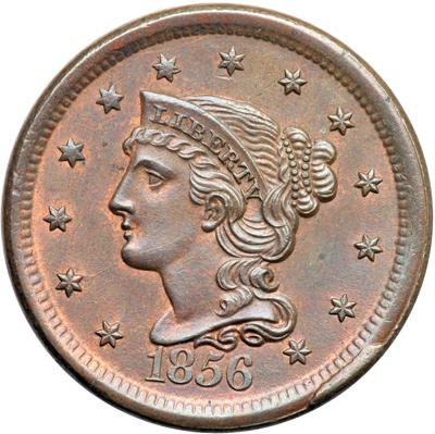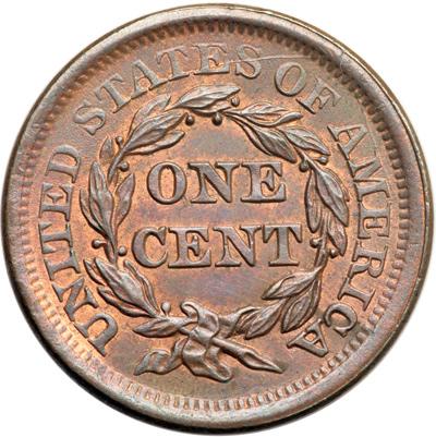 1856 N-3 R1. MS-63. Italic 5 with Obverse Rim Cud at Stars 12-13. Attractive frosty steel brown and chocolate with 20% of the planchet displaying faded mint color. Satiny mint luster covers the surfaces and this cent offers excellent eye appeal for the grade. The only mark is a tiny swipe of darker toning at the C in AMERICA. LDS, die state g, with a strong rim cud break at stars 12-13. Tied for CC#3 overall for the variety but finest of the few dozen known with the rim cud according to the Grellman census.