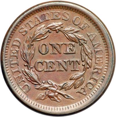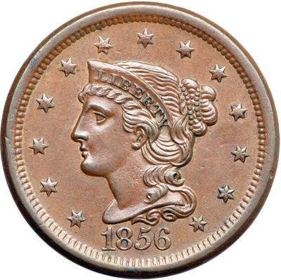 1856 N-4 R2. AU-50. Italic 5. Very attractive glossy medium brown and light chocolate. The obverse is flawless but the reverse has a spot of very fine verdigris on the left side of the second T in STATES. MDS, die state b. The tiny die line down from the F in OF is gone.