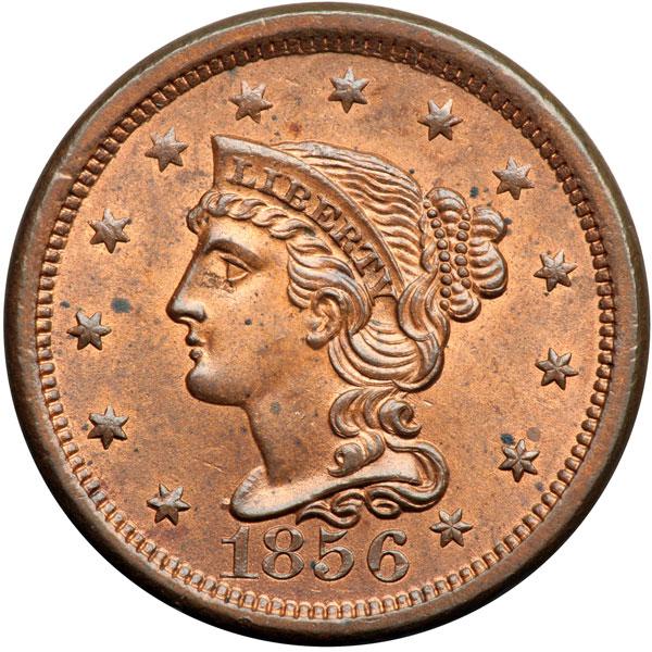 1856 N-6 R1 Upright 5 MS64. Mint red fading to light steel brown, nearly 90% of the red remaining, mostly on the reverse. A gem cent except for a few small carbon spots on both sides, including one in the field right of star 3, another close over star 12, and one inside the top of the E in CENT. E-MDS, die state a late. A couple of the fine die lines at S-OF-AM are still visible but the others, including the one at the stem tip, are gone. The fields are satiny, covered with microscopic die flowlines. Tied for CC#9 in the Grellman census. DWH #2254.