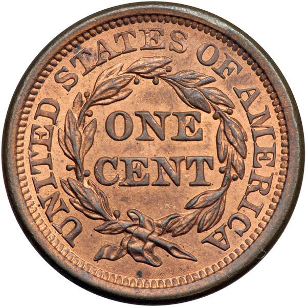 1856 N-8 R4 Upright 56 MS65. Lustrous mint red mellowing to bluish steel brown, 80% of the red remaining. The only marks visible without a good glass are a small spot of darker toning at the tip of the coronet and a speck near the dentils under the wreath. Sharply struck and very attractive. E-MDS, die state b, with a faint die crack at ME. CC#3 in the Grellman census.