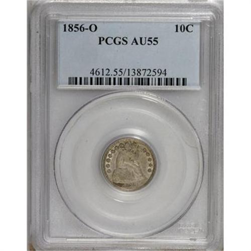 <B>1856-O 10C AU55 PCGS.</B></I> PCGS Population (9/20). NGC Census: (5/34). Mintage: 1,180,000. Numismedia Wsl. Price for NGC/PCGS coin in AU55: $392. (#4612)<BR><BR><B>Coin Engraver:</B> Christian Gobrecht<BR><BR><b>Shipping:</b> Coins & Currency (<a target="_blank" href="http://www.heritageauctions.com/common/shipping.php">view shipping information</a>)