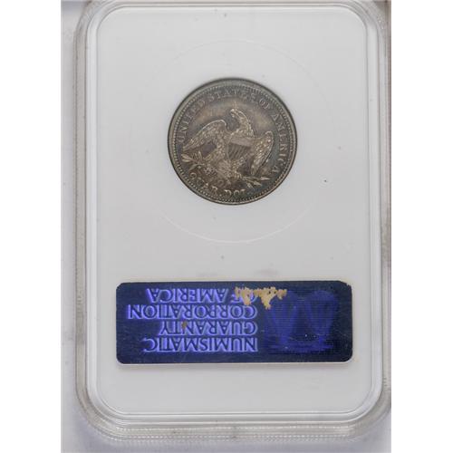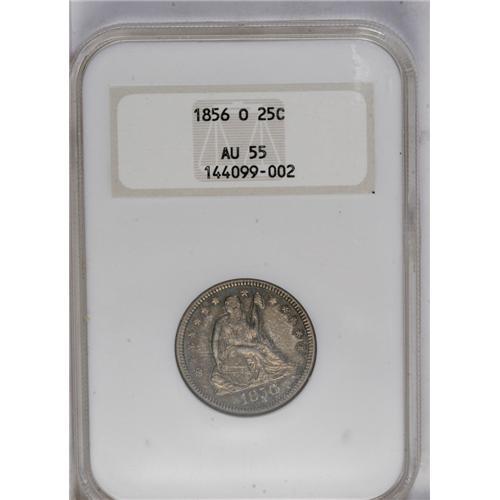 <B>1856-O<25C> AU55 NGC.</B></I> Deep electric-blue and tan-gold toning envelops this boldly impressed No Motto O-mint quarter. A couple of thin field marks are nearly concealed by the rich patina. Scarce in quality circulated grades.