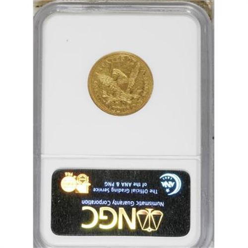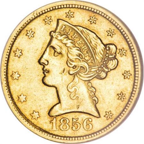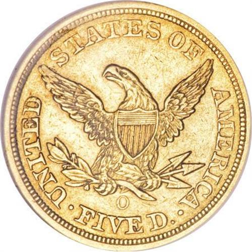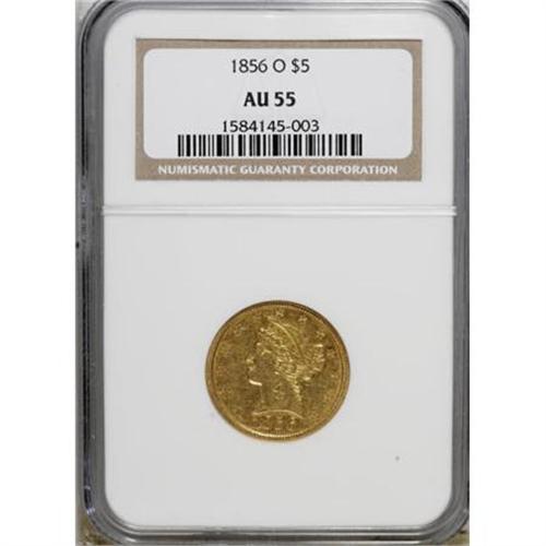 <B>1856-O $5 AU55 NGC.</B></I> A wonderful half eagle from a limited mintage of just 10,000 coins. The 1856-O is an important rarity in the half eagle series that rarely appears so nice. A few scattered surface marks are of little concern, as the overall eye appeal is excellent. Both sides have satiny green-gold luster with a trace of orange toning. Census: 5 in 55, 12 finer (1/08).<BR><BR><B>Coin Engraver:</B> Christian Gobrecht<BR><BR><b>Shipping:</b> Coins & Currency (<a target="_blank" href="http://www.heritageauctions.com/common/shipping.php">view shipping information</a>)