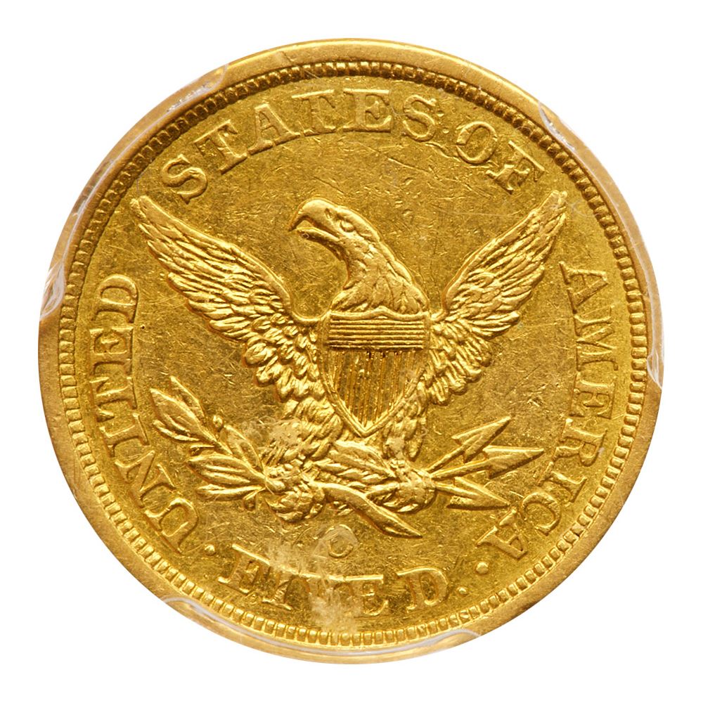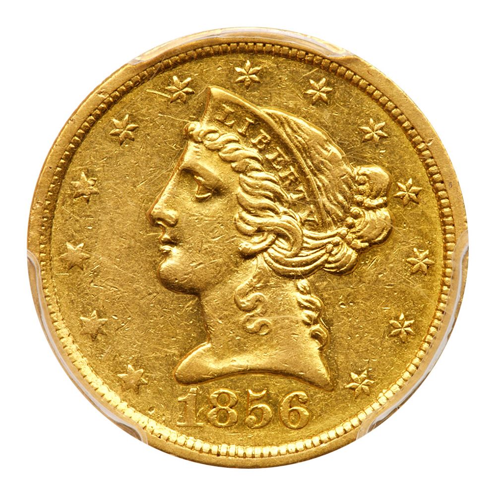 1856-O. PCGS graded AU-53. Some luster still evident in the protected areas. The strike is sharp on all but the lower left side of the obverse, with the stars lacking their radial lines and the dentils soft in the area, but sharp elsewhere as if the obverse die was slightly misaligned with the reverse commonly seen on this issue. Nice surfaces and classic orange-gold color throughout. Only 10,000 struck, of which CoinFacts notes that approximately 85 exist today, making this a very rare coin in any grade. Here is one that is quite nice and attractive. Pop 9; 18 finer at PCGS. PCGS # 8269 Estimated Value 4,500 - 5,000