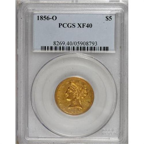 <B>1856-O $5 XF40 PCGS.</B></I> Well struck except for minor weakness on just two or three of the obverse stars, this example displays slight wear, muted luster, and some nearly microscopic hairlines on each side. A scarce, low mintage half eagle with a mintage of 10,000 pieces; second-lowest of all New Orleans five dollar issues. Population: 11 in 40, 29 finer (8/07). <BR><BR><B>Coin Engraver:</B> Christian Gobrecht<BR><BR><b>Shipping:</b> Coins & Currency (<a target="_blank" href="http://www.heritageauctions.com/common/shipping.php">view shipping information</a>)