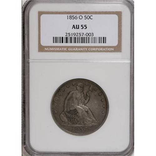 <B>1856-O 50C AU55 NGC.</B></I> NGC Census: (18/123). PCGS Population (23/97). Mintage: 2,658,000. Numismedia Wsl. Price for NGC/PCGS coin in AU55: $267. (#6288)<BR><BR><B>Coin Engraver:</B> Christian Gobrecht<BR><BR><b>Shipping:</b> Coins & Currency (<a target="_blank" href="http://www.heritageauctions.com/common/shipping.php">view shipping information</a>)