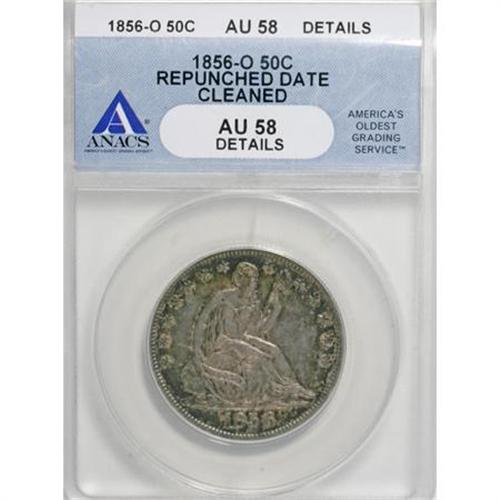 <B>1856-O 50C --Cleaned, Repunched Date--ANACS. AU58 Details.</B></I> NGC Census: (25/100). PCGS Population (14/87). Mintage: 2,658,000. Numismedia Wsl. Price for NGC/PCGS coin in AU58: $325. (#6288)<BR><BR><B>Coin Engraver:</B> Christian Gobrecht<BR><BR><b>Shipping:</b> Coins & Currency (<a target="_blank" href="http://www.heritageauctions.com/common/shipping.php">view shipping information</a>)