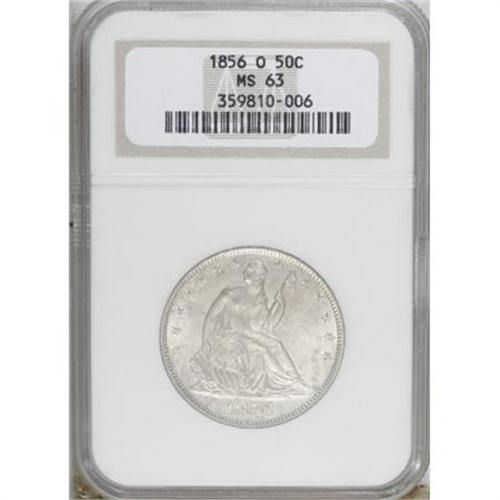<B>1856-O 50C MS63 NGC.</B></I> Boldly impressed for this New Orleans issue with just a touch of softness on the eagle's left (facing) talons. The satiny silver-gray surfaces show elements of blue and pink patina. Census: 29 in 63, 40 finer (11/07).<BR><BR><B>Coin Engraver:</B> Christian Gobrecht<BR><BR><b>Shipping:</b> Coins & Currency (<a target="_blank" href="http://www.heritageauctions.com/common/shipping.php">view shipping information</a>)
