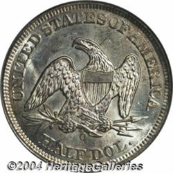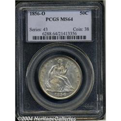 <B>1856-O<50C> MS64 PCGS.</B></I> WB-102, FS-6.5. The date was initially entered with a rising slope, then partially effaced and properly re-entered. Although all four digits have evidence of the prior logotype, the 1 and the 6 in the date offer the widest spread. This is a bright, lustrous example with blushes of pale orange toning here and there. A shallow scratch is noted above Liberty's left shoulder.<BR><I>From The Del Rio Collection, Part One.</B></I> <BR><BR><B>Important notice:</B> Heritage usually auctions material at the rate of 200-250 lots per hour. On some occasions eBay Live bid software or the Internet may not be able to keep up with the pace of the auction. We recommend placing a realistic absentee bid now as insurance to avoid disappointment. Occasionally the auctioneer may eliminate or reject an eBay Live bid, and the auctioneer may also reopen a lot after the close of the eBay live bidding (usually because we missed an audience bid), and may reject your bid even if it shows you as the winning bidder. By bidding via eBay Live, you agree that Heritage may award the lot to another bidder at its sole discretion under the circumstances described above or any other reasonable circumstances. Since eBay bids are not shown to us until we open the lot on the floor, we treat those bids just like floor bids. In most cases the floor responds before the eBay bid is presented to us, due to Internet lag time, so for consistency we have made it a policy that floor bids are always considered first over tie eBay live bids. Also please note that all Heritage lots purchased through eBay Live carry a 20% Buyer's Premium. Please make sure you read the Terms and Conditions before you bid. </span></font></tr></table></td></tr></table>