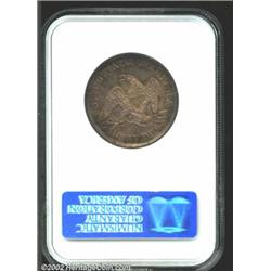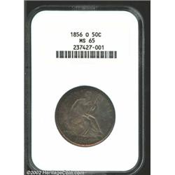 1856-O 50C MS65 NGC. Doubled Date. WB-102. Although a relatively common issue in the post-1855 No Motto Seated Half Dollar series, the '56-O (2.6 million pieces produced) is scarcer than the 1858 and 1858-O. Of course, no O-mint Seated Half is common as a Gem, and the 1856-O is no exception. What's more, Randy Wiley and Bill Bugert (1993) assign the WB-102 die marriage a Low R.7 rating in Mint State. Repunching on the date is evident below the 18 and above the 56, although one will need to a loupe to discern these features. A loupe, however, does not reveal any abrasions that would call into question the validity of the MS65 designation. There is a veritable cornucopia of pastel-lilac, salmon-pink, blue-gray, and orange-russet toning over the frosty surfaces, and the strike is razor sharp in virtually all areas. A find for the advanced Seated Half Dollar collector. NGC reports just 14 1856-O Half Dollars of all die marriages in MS65, and there is only one coin finer (7/02). Important notice: We expect to be auctioning lots at the rate of 200-250 per hour. Sometimes eBay Premier live bid software cannot keep up with that pace, so we strongly recommend that you place a realistic proxy bid now as insurance to avoid disappointment. Also please note that all Heritage/CAA lots purchased through eBay Premier carry a 20% Buyer's Premium. Please make sure you read the Terms and Conditions.