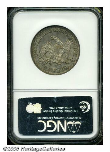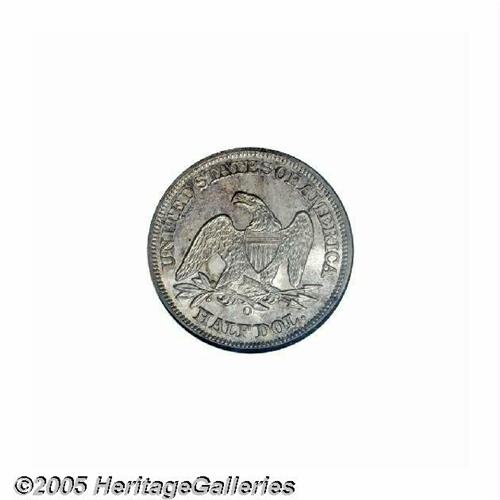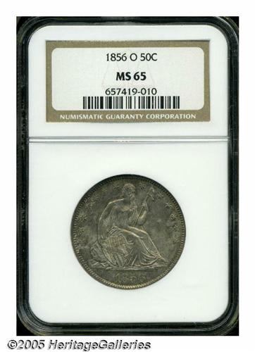 <B>1856-O<50C> MS65 NGC.</B></I> WB-104. Recut 6. The 1856-O is one of the more frequently encountered No Motto halves after 1855, although it is less available than the 1858-P and 1858-O. More than 2.65 million pieces were struck, but Gems are infrequently seen and always in demand as an O-mint type coin. The striking details on this piece are very well defined for a New Orleans product from this era. Satiny mint luster is also present with an overlay of variegated golden-gray, rose, and lilac toning over each side. A rarely seen O-mint half and a special find in Gem condition. Population: 14 in 65, 4 finer (5/05).