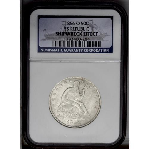 <B>1856-O<50C>--Shipwreck Effect--NGC.</B></I> Ex: SS Republic. WB-104. Recut 6. Ungraded by NGC. The pearl-gray surfaces exhibit heavy granularity in the fields, from long-term exposure to sea water. A few indentations are found on each side of the piece, along with a couple of milling marks on the upper reverse. The devices seem free of highpoint wear. Accompanied by a wooden presentation box, DVD, and certificate of authenticity from Odyssey Marine Exploration, Inc. <BR><BR><B>Important notice:</B> Heritage usually auctions material at the rate of 200-250 lots per hour. On some occasions eBay Live bid software or the Internet may not be able to keep up with the pace of the auction. We recommend placing a realistic absentee bid now as insurance to avoid disappointment. Occasionally the auctioneer may eliminate or reject an eBay Live bid, and the auctioneer may also reopen a lot after the close of the eBay live bidding (usually because we missed an audience bid), and may reject your bid even if it shows you as the winning bidder. By bidding via eBay Live, you agree that Heritage may award the lot to another bidder at its sole discretion under the circumstances described above or any other reasonable circumstances. Since eBay bids are not shown to us until we open the lot on the floor, we treat those bids just like floor bids. In most cases the floor responds before the eBay bid is presented to us, due to Internet lag time, so for consistency we have made it a policy that floor bids are always considered first over tie eBay live bids. Also please note that all Heritage lots purchased through eBay Live carry a 20% Buyer's Premium. Please make sure you read the Terms and Conditions before you bid. This lot is being auctioned in conjunction with a live floor auction by Heritage Galleries & Auctioneers. All final auction and invoice information will be supplied by Heritage Galleries & Auctioneers, and all other information should be considered preliminary. Lot:2001 <BR><BR><B>Winning Notification and Billing:</B> After the FINAL session in this auction is complete, Heritage will send e-mail and snail mail invoices. This process normally takes several days. All final auction and invoice information will be supplied by Heritage Galleries & Auctioneers, and all other information should be considered preliminary. <BR><BR>This auction will be conducted on a live auction floor and over the Internet through eBay Live. If you choose to place an absentee bid, please take a moment to <font color='#0000ff'><u><a href='http://pages.ebay.com/liveauctions/help/before/laabsentee.html'>learn how eBay Live absentee bidding works</a></u></font><font color='#000000'>