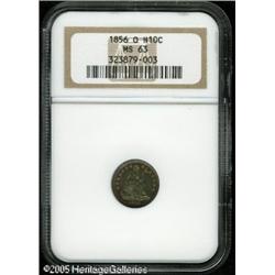 <B>1856-O H10C MS63 NGC.</B></I> Beautifully toned in variegated shades of blue-green, rose, and lemon-yellow, with sharp definition and vibrant underlying luster. There are a couple of small planchet flaws (as struck) on the central reverse fields, and the obverse reveals wispy die cracks (as produced) near the peripheries, along with a shallow pinscratch in the left field area. An extremely scarce New Orleans issue in Mint State. Population: 6 in 63, 13 finer (1/05). Lot:6139
