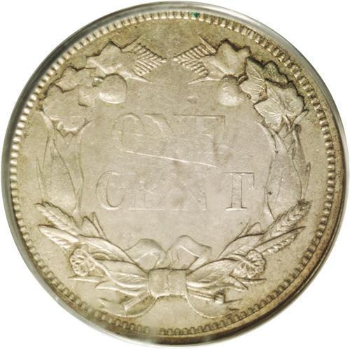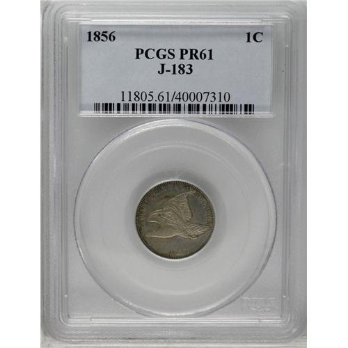 <B>1856<P1C> Flying Eagle Cent, Judd-183, Pollock-217, High R.7, PR61 PCGS.</B></I> Snow-4d. Low Leaves Reverse, Open E in ONE. Struck in nickel alloy (75% copper, 25% nickel) with a plain edge. According to Rick Snow in his <I>Flying Eagle and Indian Cent Attribution Guide, 2nd Edition, Volume 1, 1856-1858</B></I> (2001), only 3 to 4 examples are known of S-4d. For S-4 in all metals is likely Low R.5. The die pairing is unusual since the Low Leaves reverse was not introduced until 1858. Clearly, the present piece was struck in 1858 or later to satisfy collector demand. Great care was not taken by the mint, however, since the strike is soft on the eagle's head and neck, as well as on ONE CENT and the upper left cotton leaves. A few wispy marks cross the reverse center, but this rare 1856 Flying Eagle cent is otherwise unblemished.