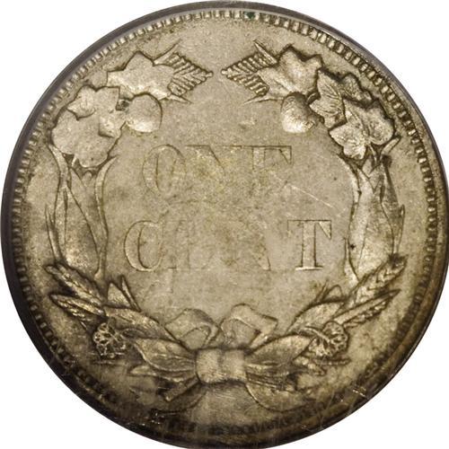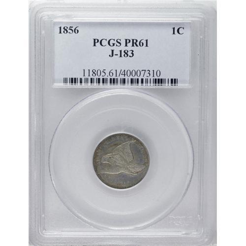 <B>1856 P1C Flying Eagle Cent, Judd-183, Pollock-217, High R.7, PR61 PCGS.</B></I> Snow-4d. Low Leaves Reverse, Open E in ONE. Struck in nickel alloy (75% copper, 25% nickel) with a plain edge. According to Rick Snow in his <I>Flying Eagle and Indian Cent Attribution Guide, 2nd Edition, Volume 1, 1856-1858</B></I> (2001), only three to four examples are known of S-4d. For S-4 in all metals is likely Low R.5. The die pairing is unusual since the Low Leaves reverse was not introduced until 1858. Clearly, the present piece was struck in 1858 or later to satisfy collector demand. Great care was not taken by the mint, however, since the strike is soft on the eagle's head and neck, as well as on ONE CENT and the upper left cotton leaves. A few wispy marks cross the reverse center, but this rare 1856 Flying Eagle cent is otherwise unblemished.<BR><BR><b>Shipping:</b> Coin/Currency (<a target="_blank" href="http://www.heritageauctions.com/common/shipping.php">view shipping information</a>)