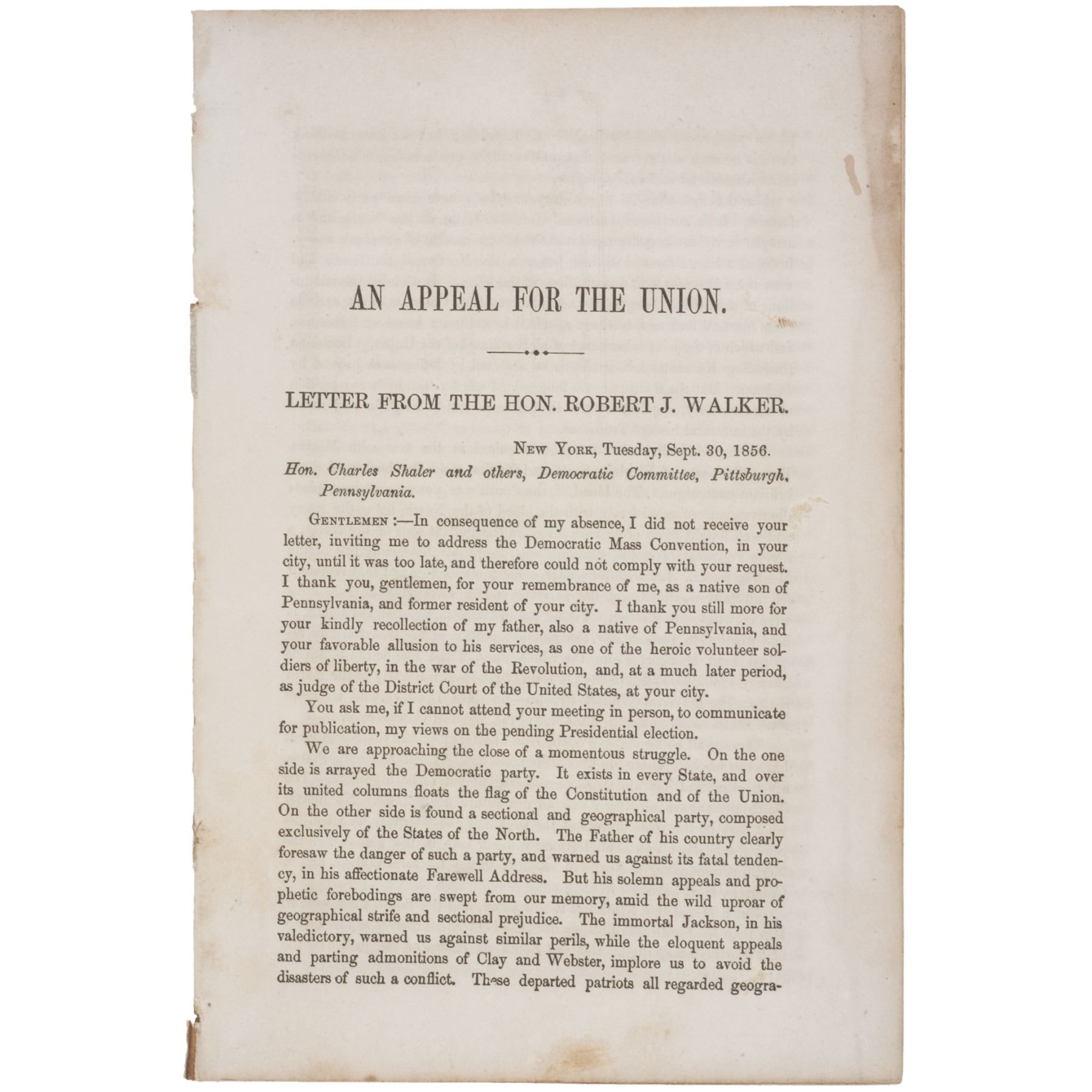 1856-Dated, First edition, Presidential Campaign Imprint entitled, ““AN APPEAL FOR THE UNION - A printed Letter from the Hon. Robert J. Walker.,” New York, John F. Trow, Printer, Choice Extremely Fine.
