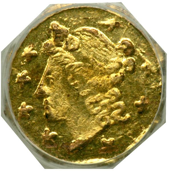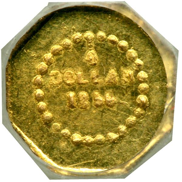 1856 Quarter Dollar Octagonal. Breen and Gillio-107. Low Rarity 4. NGC graded MS-64. Lightly toned and prooflike. Crude stars around a crude Liberty head. Struck during the First Period. Pop 10; 2 finer in 65.