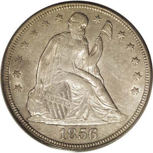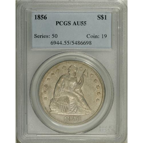 <B>1856 S$1 AU55 PCGS.</B></I> A pleasing example of this difficult date. A few parts of the design on each side are weakly impressed, including the eagle's left wing and leg. Both sides have light silver-gray color with considerable remaining luster. Population: 22 in 55, 33 finer (12/06).<BR><BR><b>Shipping:</b> Coin/Currency (<a target="_blank" href="http://www.heritageauctions.com/common/shipping.php">view shipping information</a>)