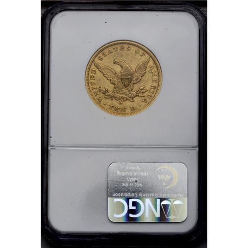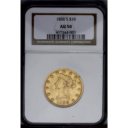 <B>1856-S<$10> AU50 NGC.</B></I> Medium S. Glowing luster is substantial for the grade. A few moderate marks are seen on Liberty's cheek and on the obverse rim at 2 o'clock. A scarce issue, albeit more available than most S-mint dates of the era.<BR><I>From The Steve Glenn Collection.</B></I> <BR><BR><B>Important notice:</B> Heritage usually auctions material at the rate of 200-250 lots per hour. On some occasions eBay Live bid software or the Internet may not be able to keep up with the pace of the auction. We recommend placing a realistic absentee bid now as insurance to avoid disappointment. Occasionally the auctioneer may eliminate or reject an eBay Live bid, and the auctioneer may also reopen a lot after the close of the eBay live bidding (usually because we missed an audience bid), and may reject your bid even if it shows you as the winning bidder. By bidding via eBay Live, you agree that Heritage may award the lot to another bidder at its sole discretion under the circumstances described above or any other reasonable circumstances. Since eBay bids are not shown to us until we open the lot on the floor, we treat those bids just like floor bids. In most cases the floor responds before the eBay bid is presented to us, due to Internet lag time, so for consistency we have made it a policy that floor bids are always considered first over tie eBay live bids. Also please note that all Heritage lots purchased through eBay Live carry a 20% Buyer's Premium. Please make sure you read the Terms and Conditions before you bid. This lot is being auctioned in conjunction with a live floor auction by Heritage Galleries & Auctioneers. All final auction and invoice information will be supplied by Heritage Galleries & Auctioneers, and all other information should be considered preliminary. Lot:3946 <BR><BR><B>Winning Notification and Billing:</B> After the FINAL session in this auction is complete, Heritage will send e-mail and snail mail invoices. This process normally takes several days. All final auction and invoice information will be supplied by Heritage Galleries & Auctioneers, and all other information should be considered preliminary. <BR><BR>This auction will be conducted on a live auction floor and over the Internet through eBay Live. If you choose to place an absentee bid, please take a moment to <font color='#0000ff'><u><a href='http://pages.ebay.com/liveauctions/help/before/laabsentee.html'>learn how eBay Live absentee bidding works</a></u></font><font color='#000000'>